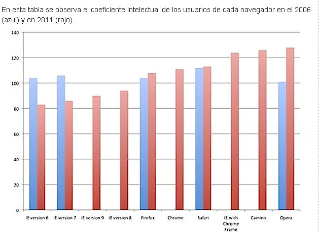 Por otra parte en el lado opuesto, en el análisis vemos que los usuarios de Opera son los que se consideran más inteligentes logrando más de 120 puntos como cociente intelectual; los navegadores más famosos Google Chrome y Firefox, se sitúan bajo un nivel aceptable, solamente que Chrome supera levemente a Firefox. Resulta curioso, ya que generalmente Internet Explorer viene siendo el navegador por defecto de Windows, promoviendo que éste sea utilizado por muchas personas que ni siquiera saben que existen otros navegadores. Abajo la gráfica comparativa.
