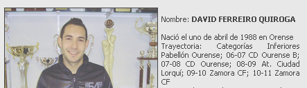 David Ferreiro Quiroga nació en Orense el 1 de Abril de 1988. Tiene 23 años, mide 1,70 m. y pesa 63 kg. Se inició en el mundo del fútbol jugando en el Pabellón Ourense. Fichó por el Ourense, para jugar en su filial entre los años 2006 y 2008 y posteriormente en el 2008 en el primer equipo.