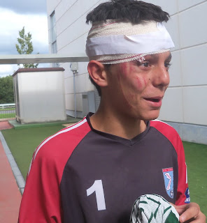 Excelente Torneo y muy buena organización en el I Milagrosa Cup celebrado en Lugo el Sábado. Muy buena asimismo la progresión demostrada por el equipo infantil del Barbadás que dio una imagen totalmente distinta a partidos anteriores consiguiendo meterse en la final con un empate 0-0 ante el Calasancio, vencer con una gran remontada a un Milagrosa con muy buenos futbolistas y que seguro hará un buen papel en la Liga Gallega en su grupo norte, y ganar por 3-1 al Villalvés. La final de nuevo ante el Calasancio con una primera mitad muy igualada y superioridad de los de Monforte en la segunda en la que los azules acusaron las bajas en la parte defensiva por distintos problemas destacando la lesión del portero Pablo (en la imagen) que recibió el impacto involuntario de la bota de un jugador del Villalbés en su cabeza, lo que supuso un susto notable para todos los presentes. Fue trasladado a un centro sanitario de Lugo en donde se le aplicaron seis puntos de sutura y tendrá una semana de reposo. Felicitar al Calasancio con jugadores que marcan diferencias y a la organización, especialmente a Oscar Seijas pendiente en todo momento de que nada faltase y ayudando en todos los conceptos en el momento de la lesión de Pablo.