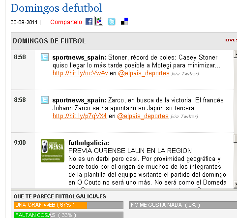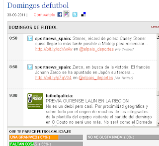 Una nueva herramienta que seguro será de interés para los lectores se acaba de añadir a FUTBOLGALICIA. En principio hoy sábado la mayoría de las noticias que allí aparecerán serán del fútbol en general y tambíén de otros deportes EN TIEMPO REAL, es decir las últimas novedades que van apareciendo en los medios.